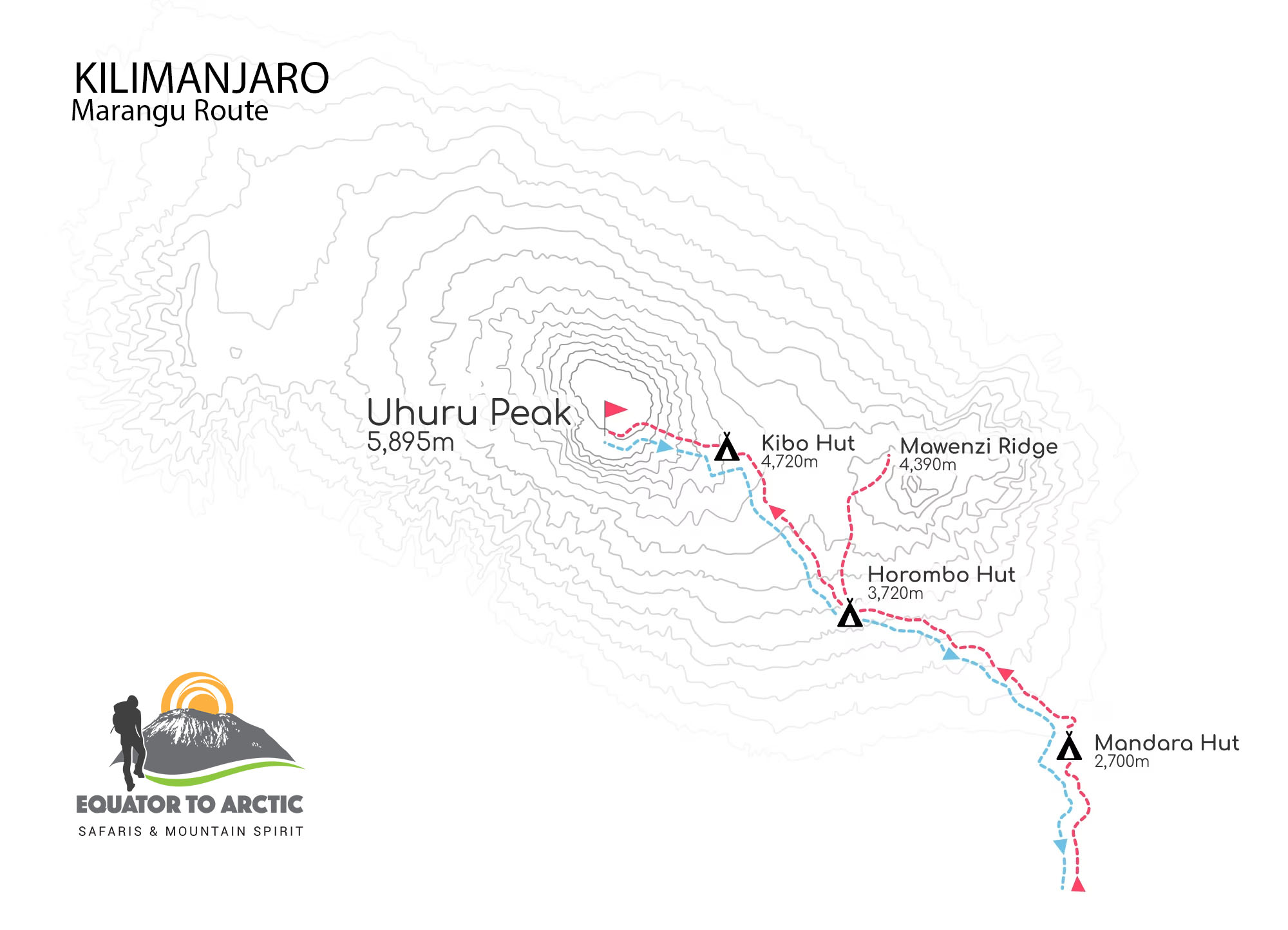 Marangu Route is the easiest and shortest route to Kilimanjaro’s summit and is known as the “Coca Cola” or “tourist” route. This is the only route on Kilimanjaro with the comforts of solar-powered sleeping huts and comfortable beds at every camp. The huts are communal, and each bunk has a sponge mattress and pillow. There are 60 beds at both Mandara and Kibo Huts and 120 beds at Horombo Hut. Bathrooms and running water are available at the two lower huts. Basic men’s and ladies’ latrines are available at the last camp. All climbing groups, often from several countries around the world, share meals in dining huts providing a jovial and energetic atmosphere. Soft drinks, bottled water, and beer may be for sale at the huts.